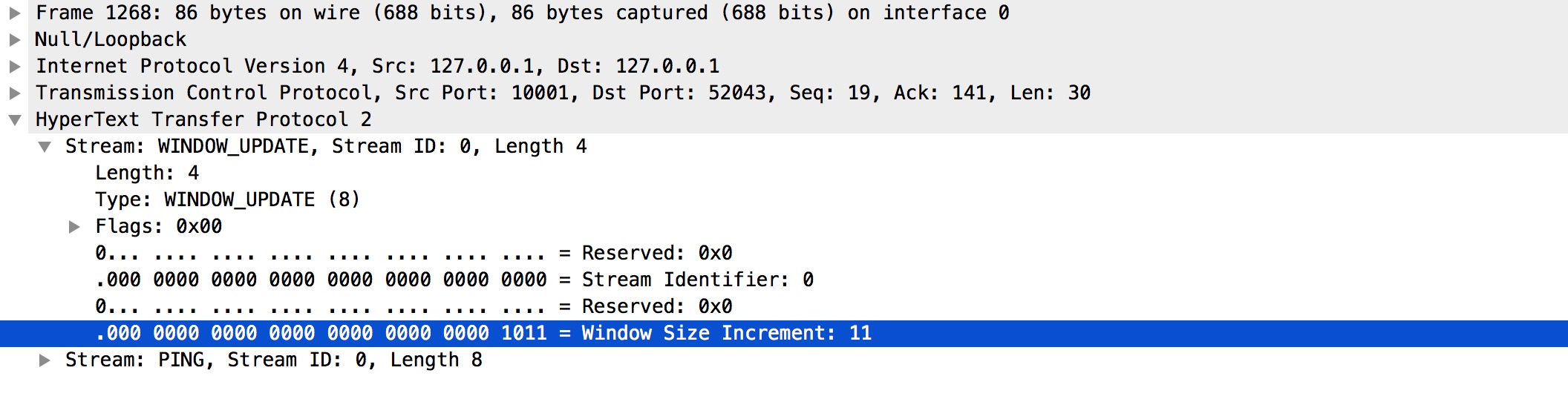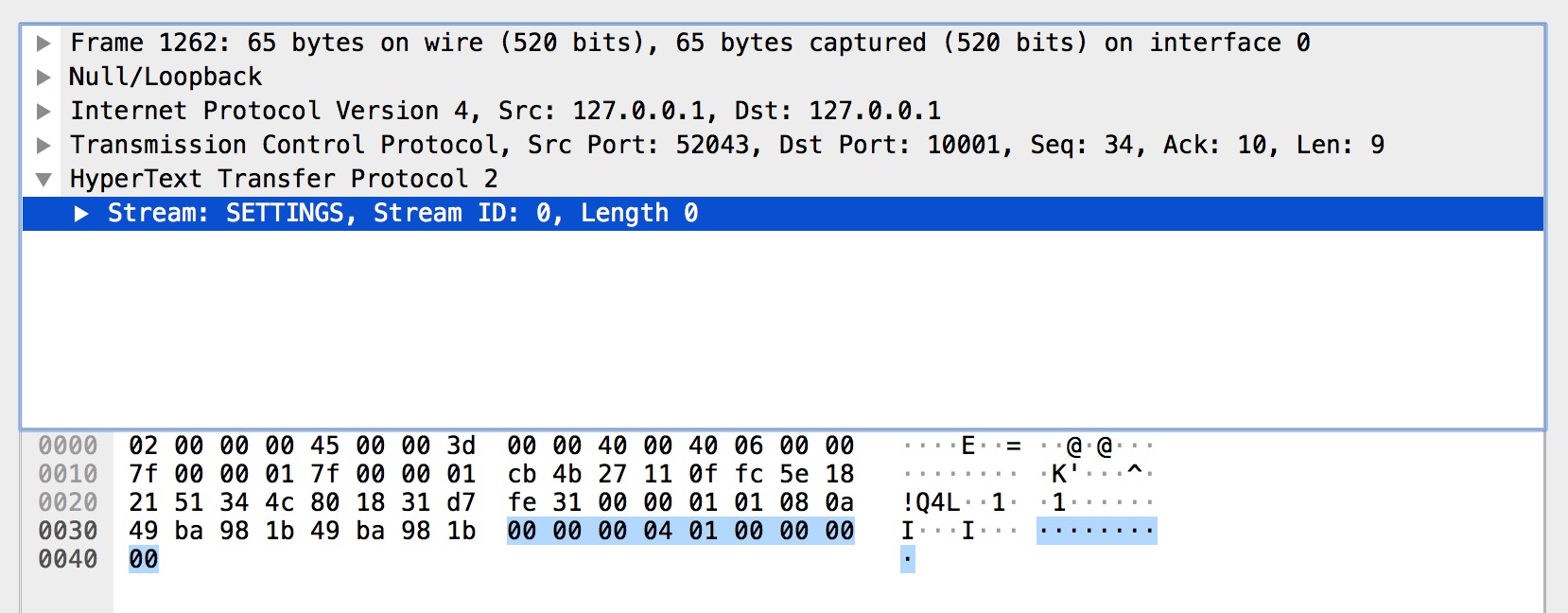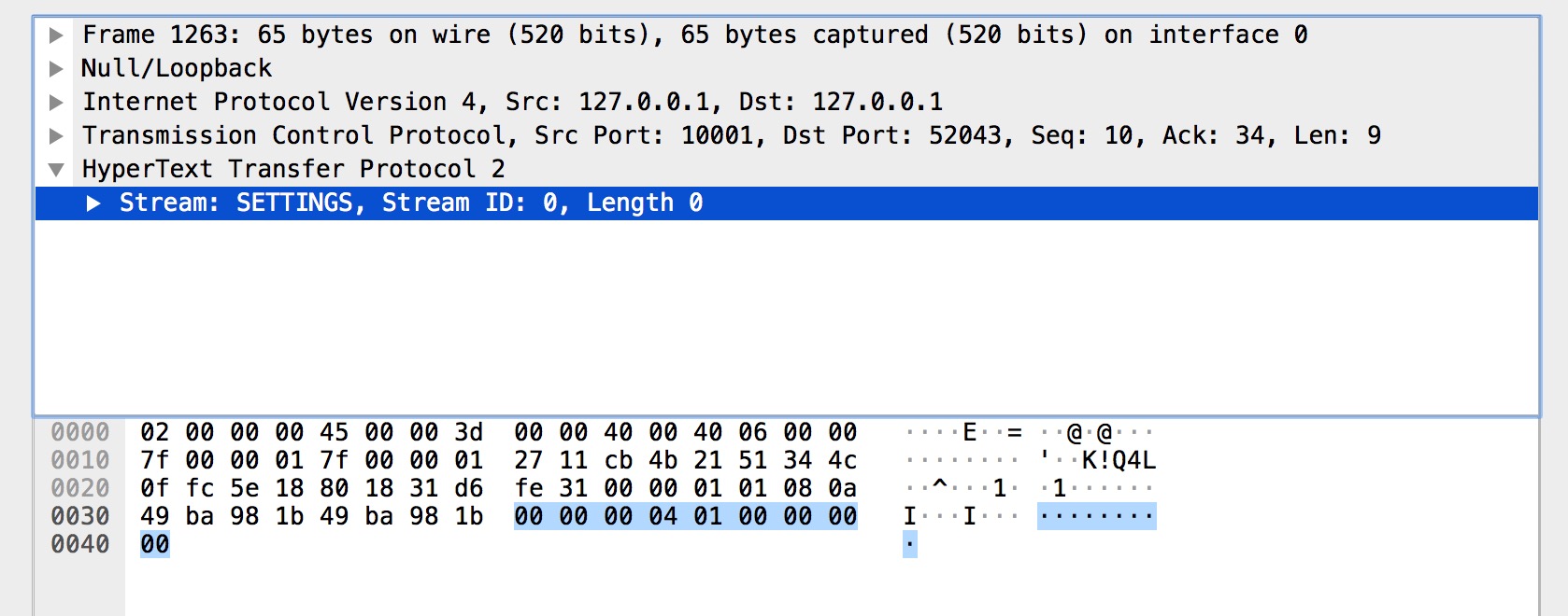 而上图的 SETTINGS 帧都是空 SETTINGS 帧,图一是客户端连接的前言(Magic 和 SETTINGS 帧分别组成连接前言)。图二是服务端的。另外我们从图中可以看到多个 SETTINGS 帧,这是为什么呢?是因为发送完连接前言后,客户端和服务端还需要有一步互动确认的动作。对应的就是带有 ACK 标识 SETTINGS 帧。