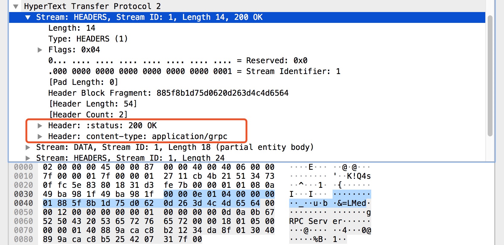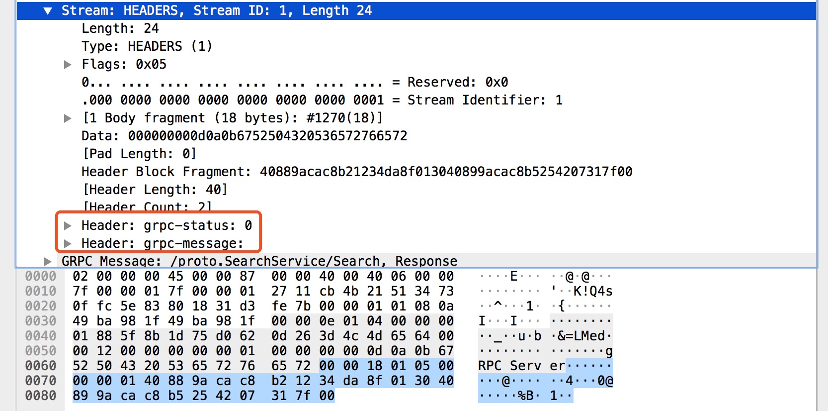 在上图中 HEADERS 帧主要承载了 gRPC 状态 和 gRPC 状态消息,图中的 grpc-status 和 grpc-message 就是我们的 gRPC 调用状态的结果。