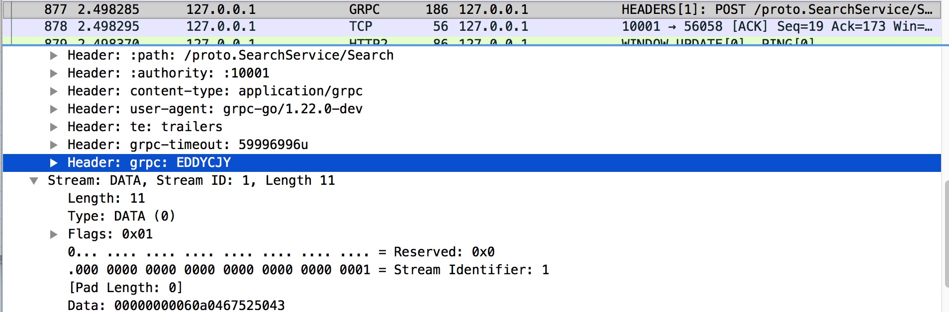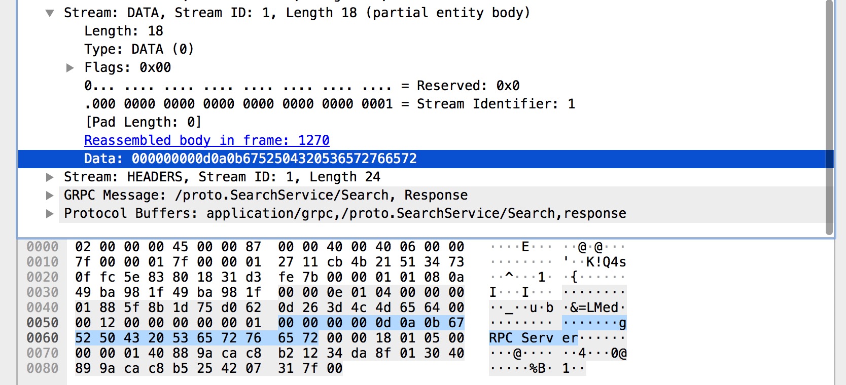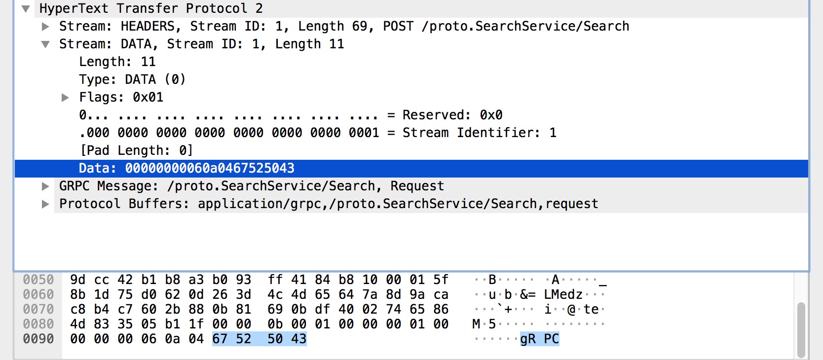 DATA 帧的主要作用是装填主体信息,是数据帧。而在上图中,可以很明显看到我们的请求参数 gRPC 存储在里面。只需要了解到这一点就可以了。