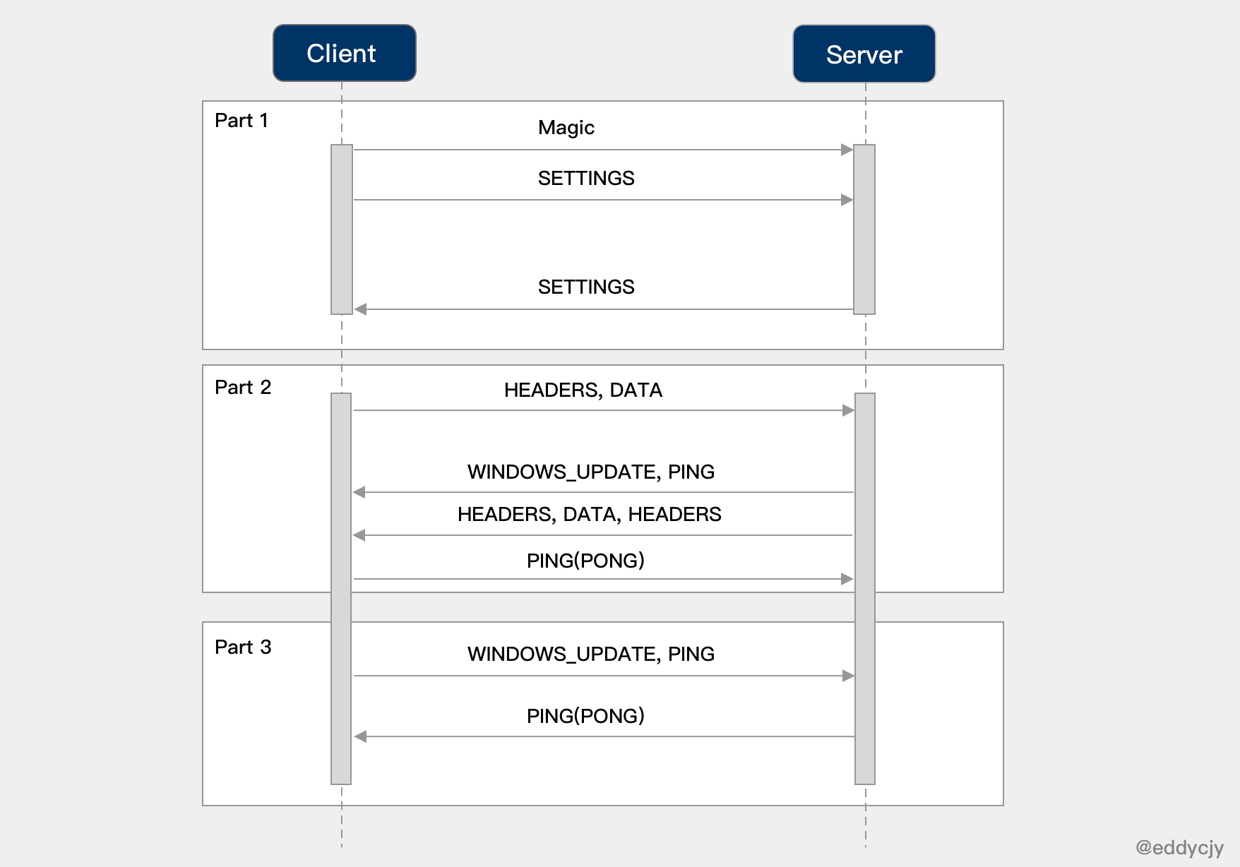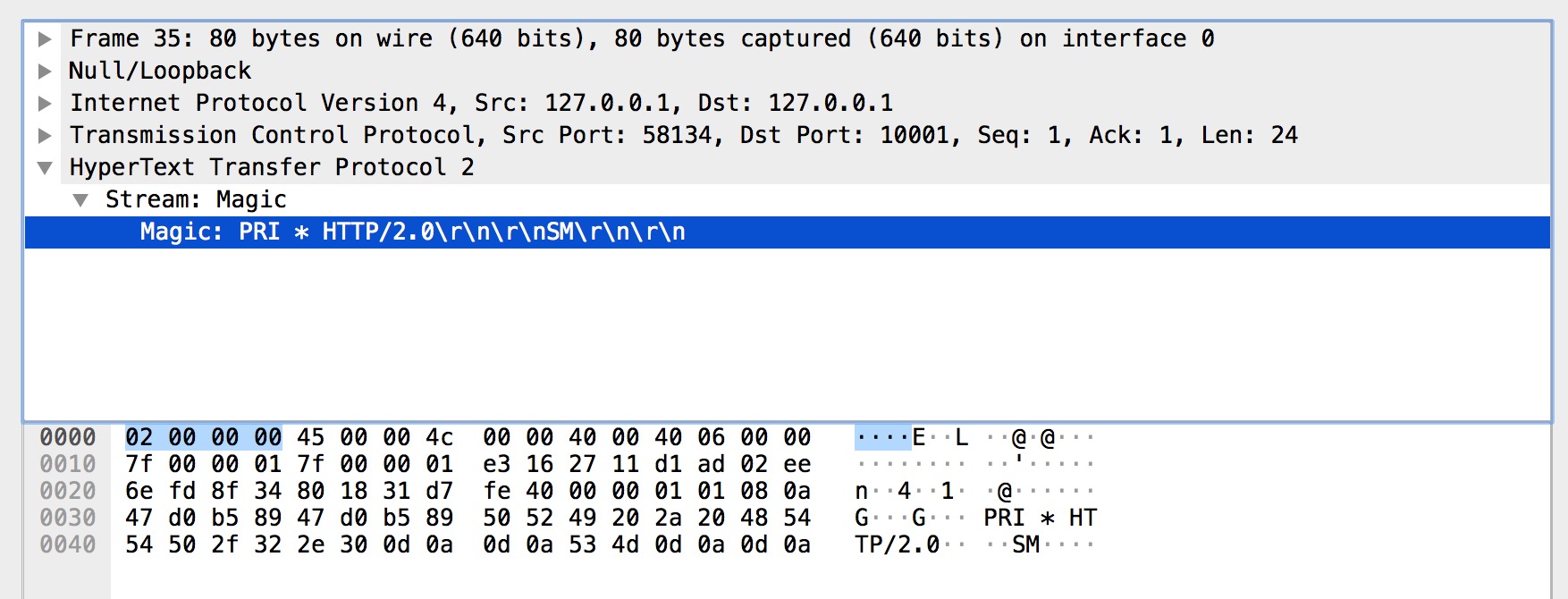 而上图中的 Magic 帧是客户端的前言之一,内容为 PRI * HTTP/2.0\r\n\r\nSM\r\n\r\n,以确定启用 HTTP/2 连接。
