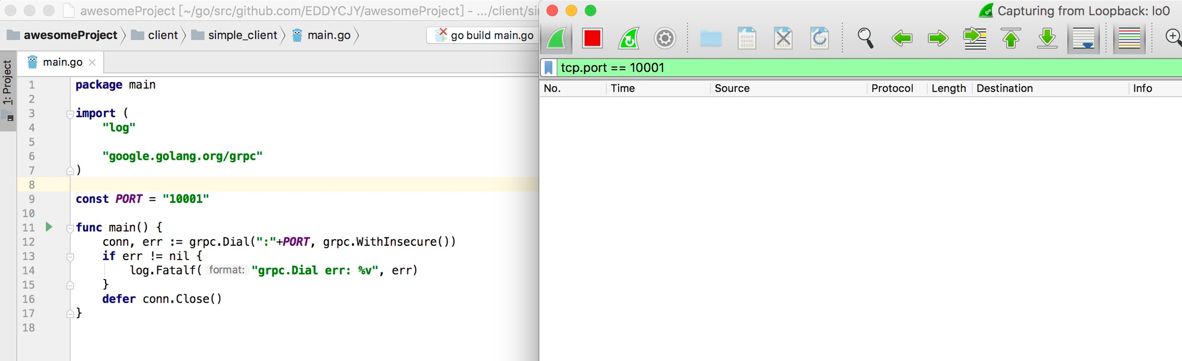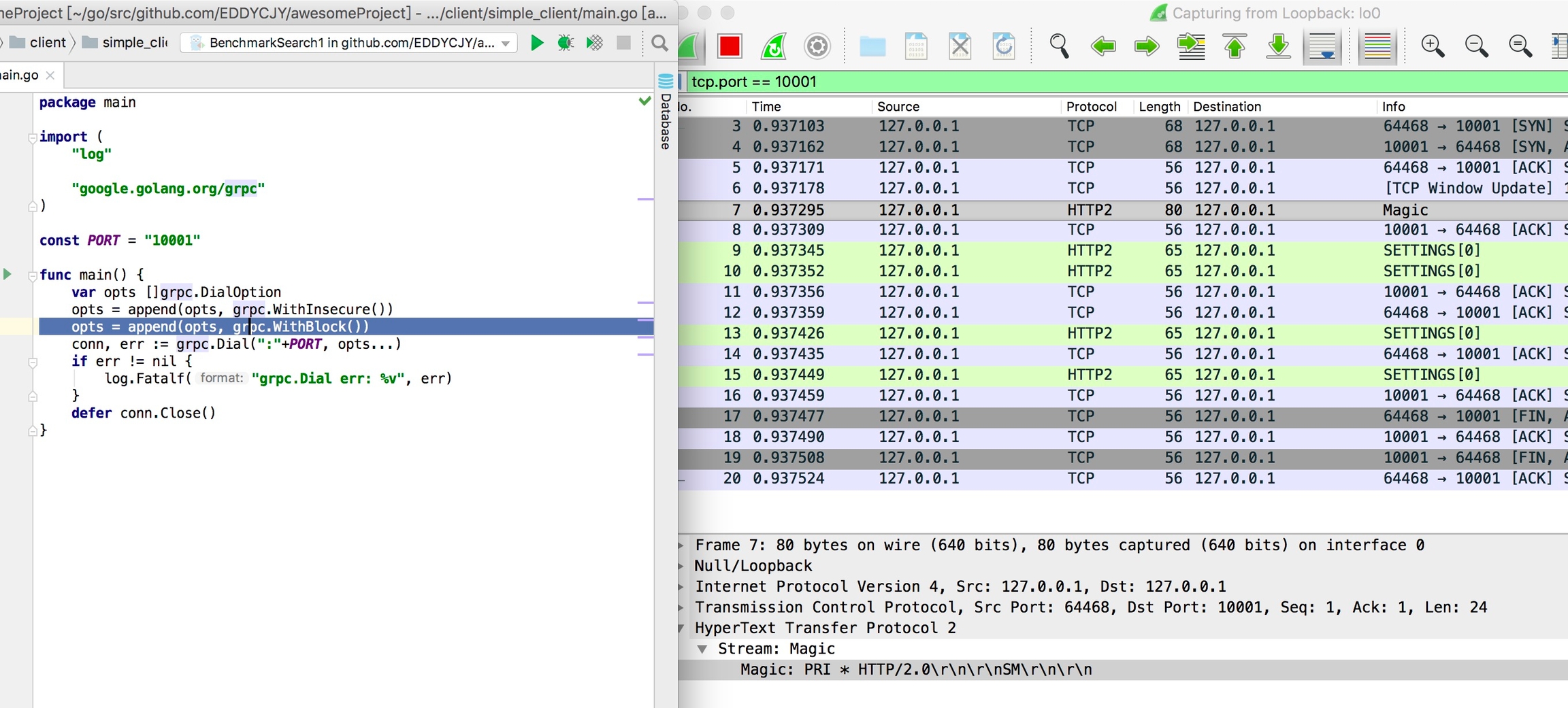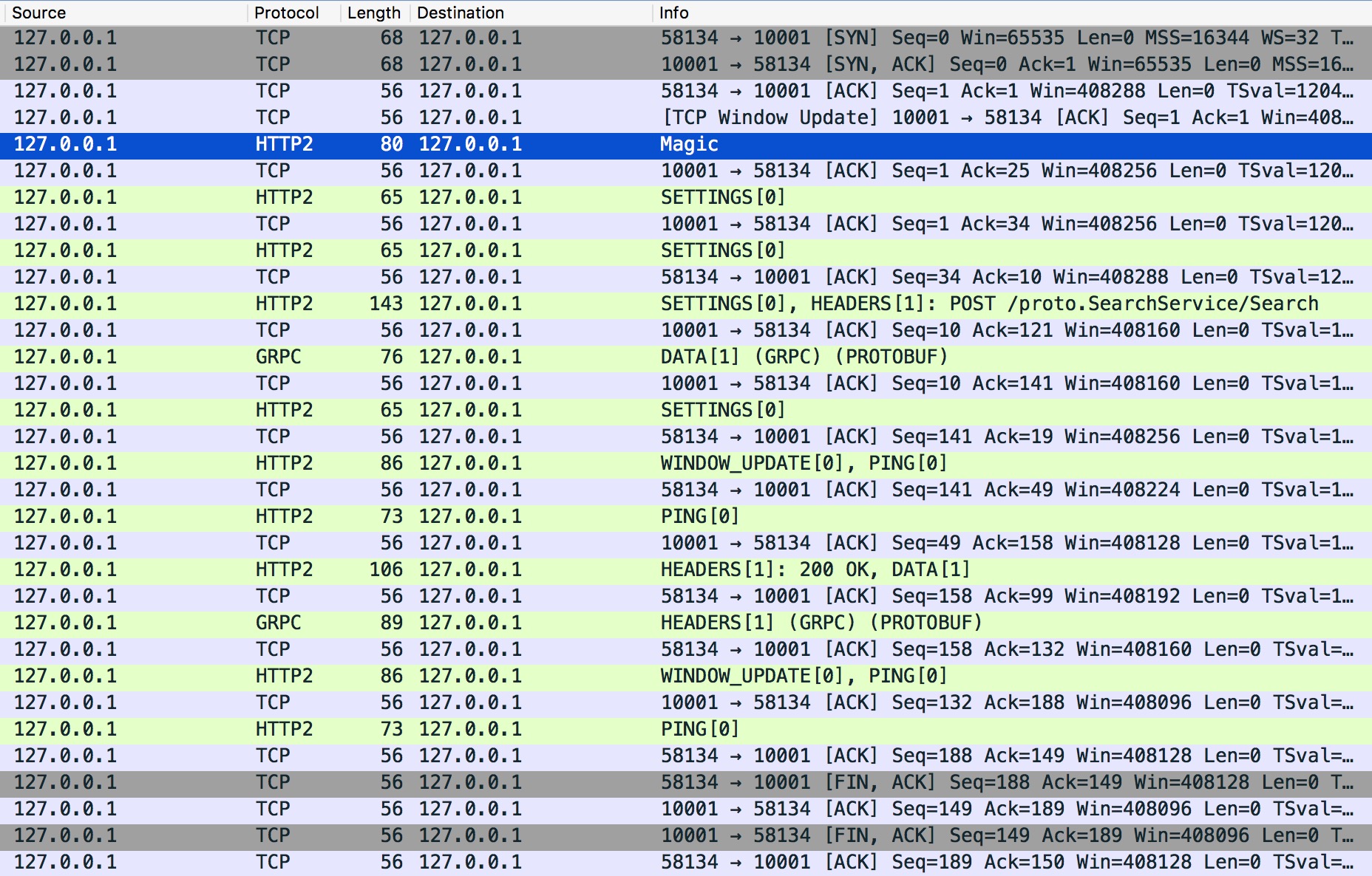 在开始分析之前,我们要先 gRPC 的调用有一个初始印象。那么最简单的就是对 Client 端调用 Server 端进行抓包去剖析,看看整个过程中它都做了些什么事。如下图: