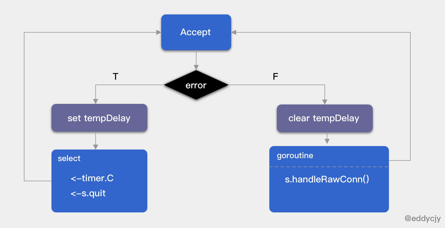 - Server 监听是循环等待连接,若没有则休眠,最大休眠时间 1s;若接收到新请求则起一个新的 goroutine 去处理。