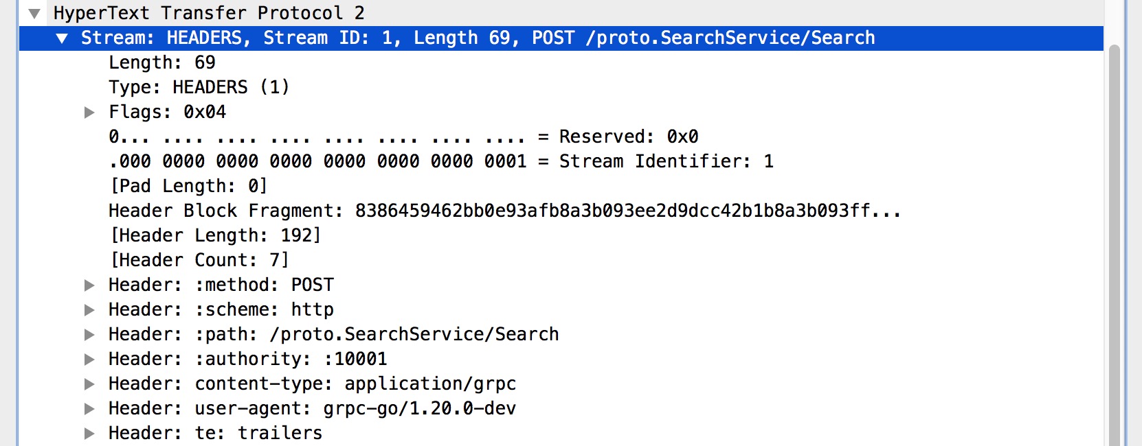 - gRPC 的附加信息都会体现在 HEADERS 帧,数据在 DATA 帧上。