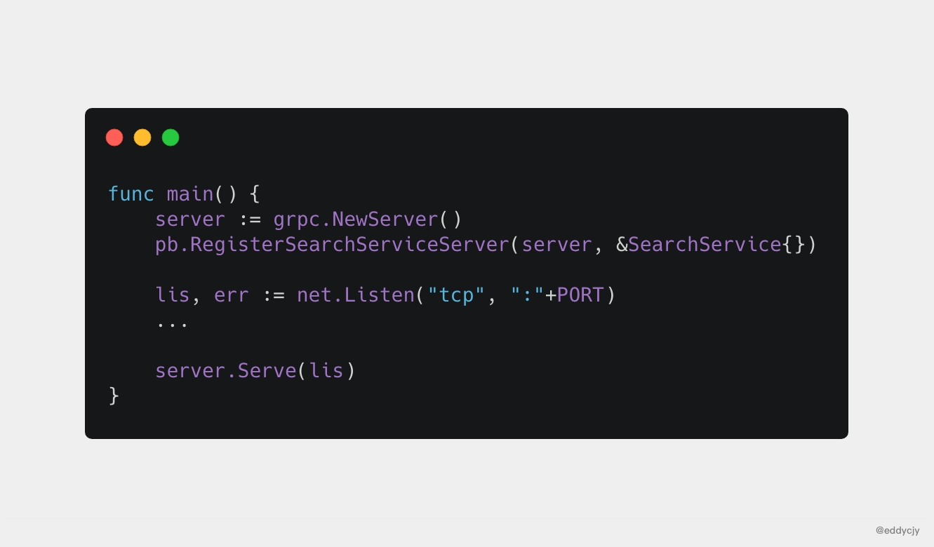 - 将 SearchService(其包含需要被调用的服务端接口)注册到 gRPC Server。 的内部注册中心。这样可以在接受到请求时,通过内部的 “服务发现”,发现该服务端接口并转接进行逻辑处理。