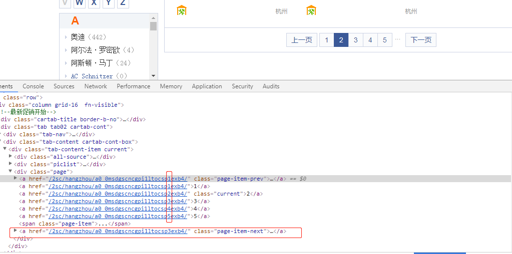 通过分析页面可以得知分页链接是有一定规律的,例如:/2sc/hangzhou/a0_0msdgscncgpi1ltocsp2exb4/,可以发现 sp%d,sp 后面为页码
