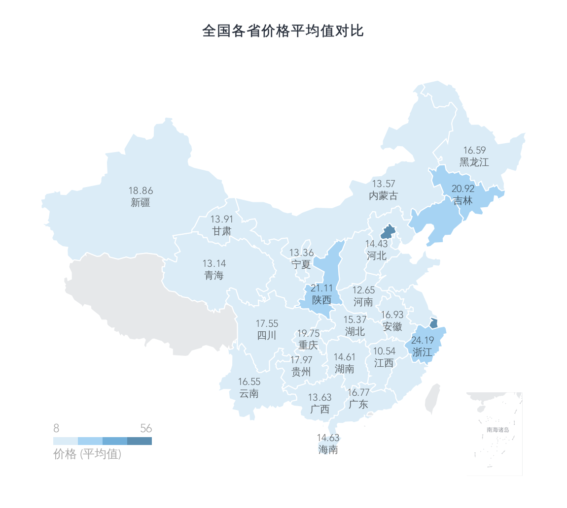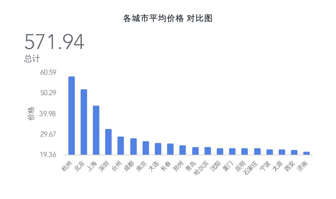 在各城市的平均价格对比中,我们可以发现北上广深里的北京、上海、深圳都在榜单上,而近年势头较猛的杭州直接占领了榜首,且后几名都有一些距离