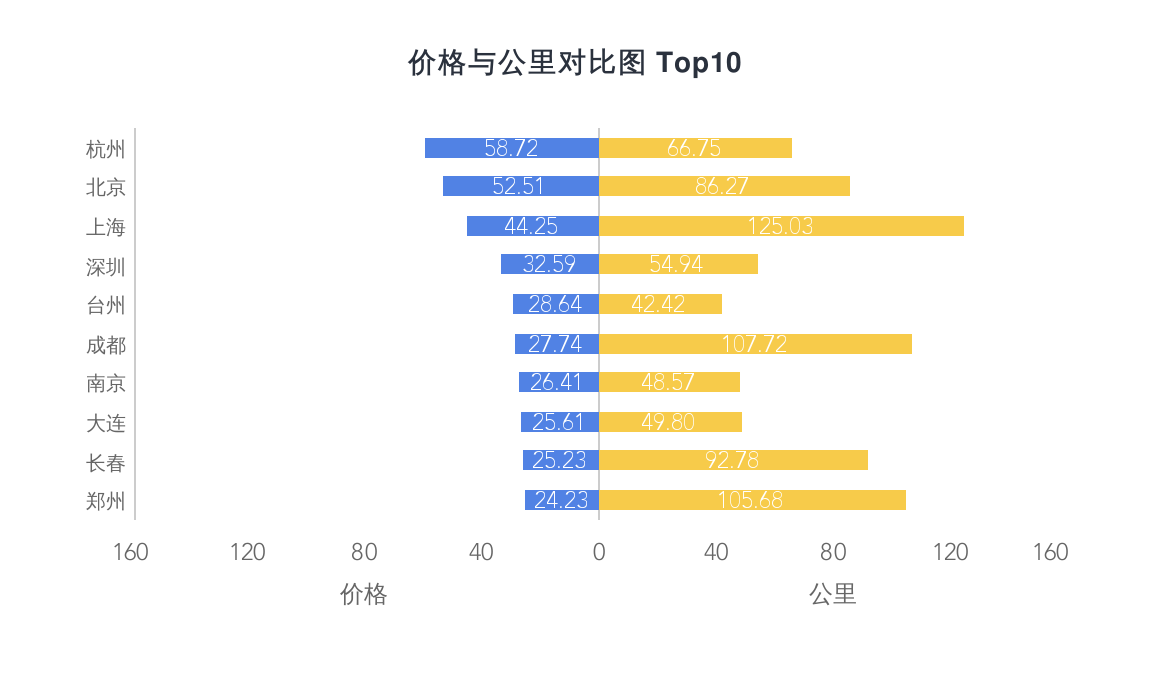 我们可以看到价格和公里数的对比,上海、成都、郑州的等比差异是有点大,感觉有需求的话可以在价格和公里数上做一个衡量