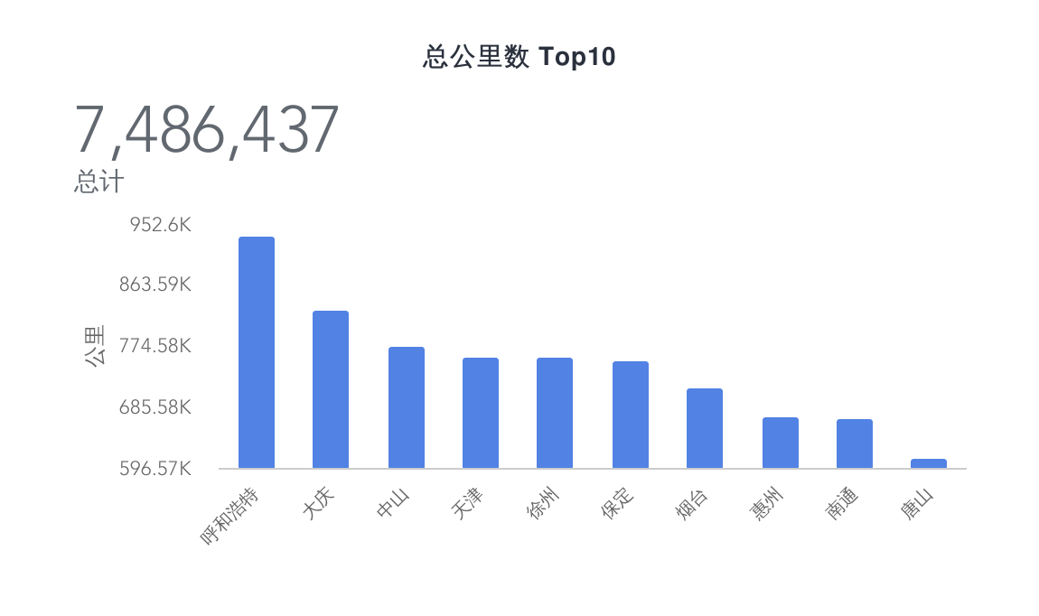 这图有点儿有趣,粗略的统计了一下总公里数。在前几张图里,平均价格排名较高的统统没有出现在这里,反倒是呼和浩特、大庆、中山等出现在了榜首