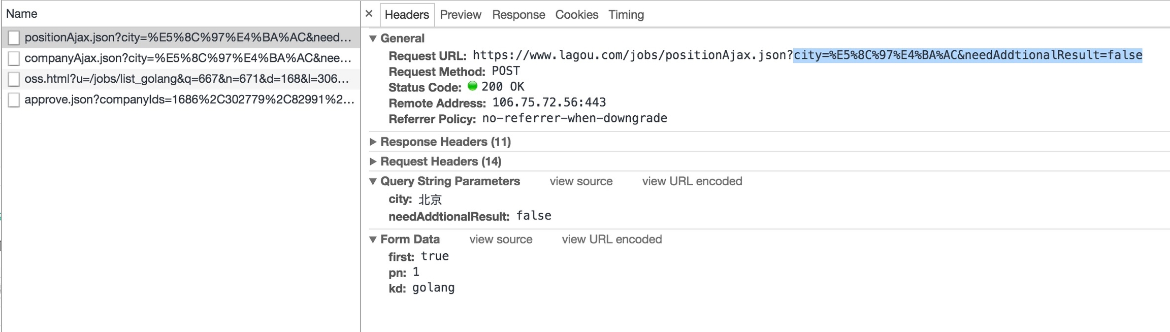搜索 golang 关键字,打开页面 F12 就能看到它发送了四个请求,留意 positionAjax.json 这个请求