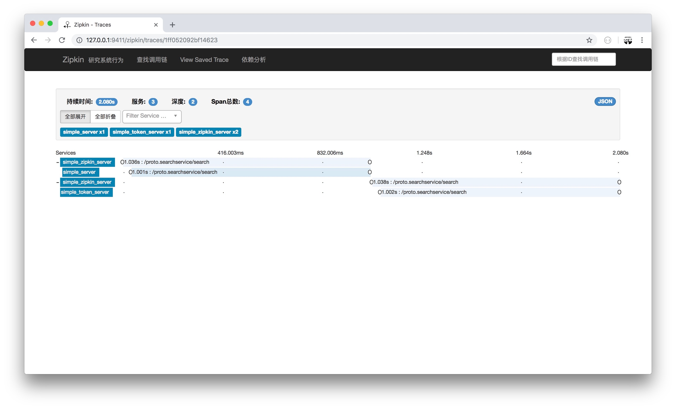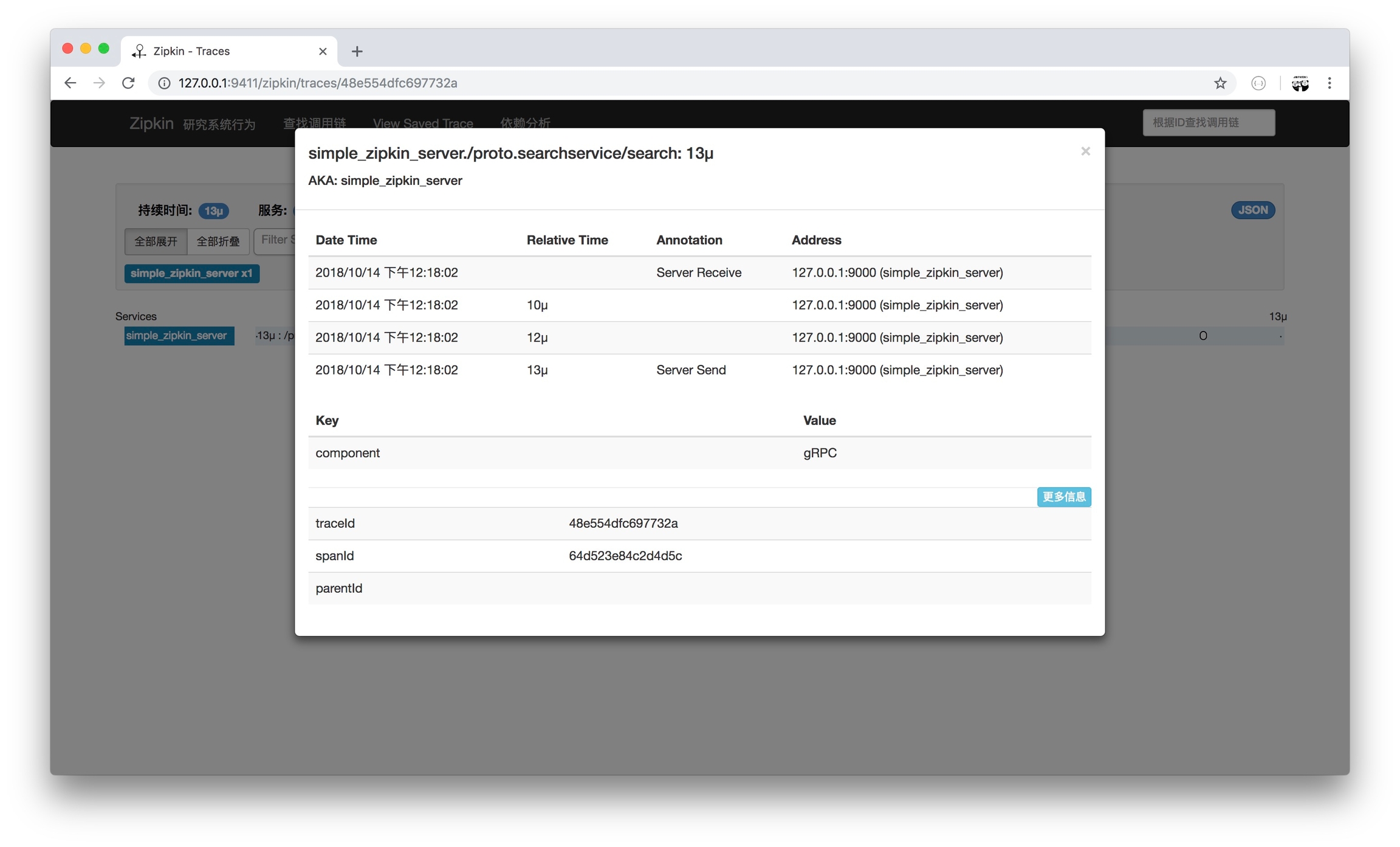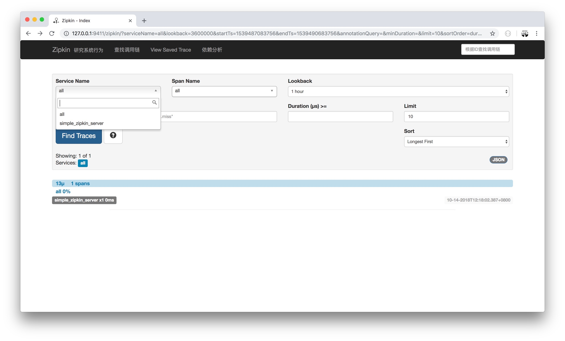启动 Server.go,执行 Client.go。查看 http://127.0.0.1:9411/zipkin/ 的示意图:
