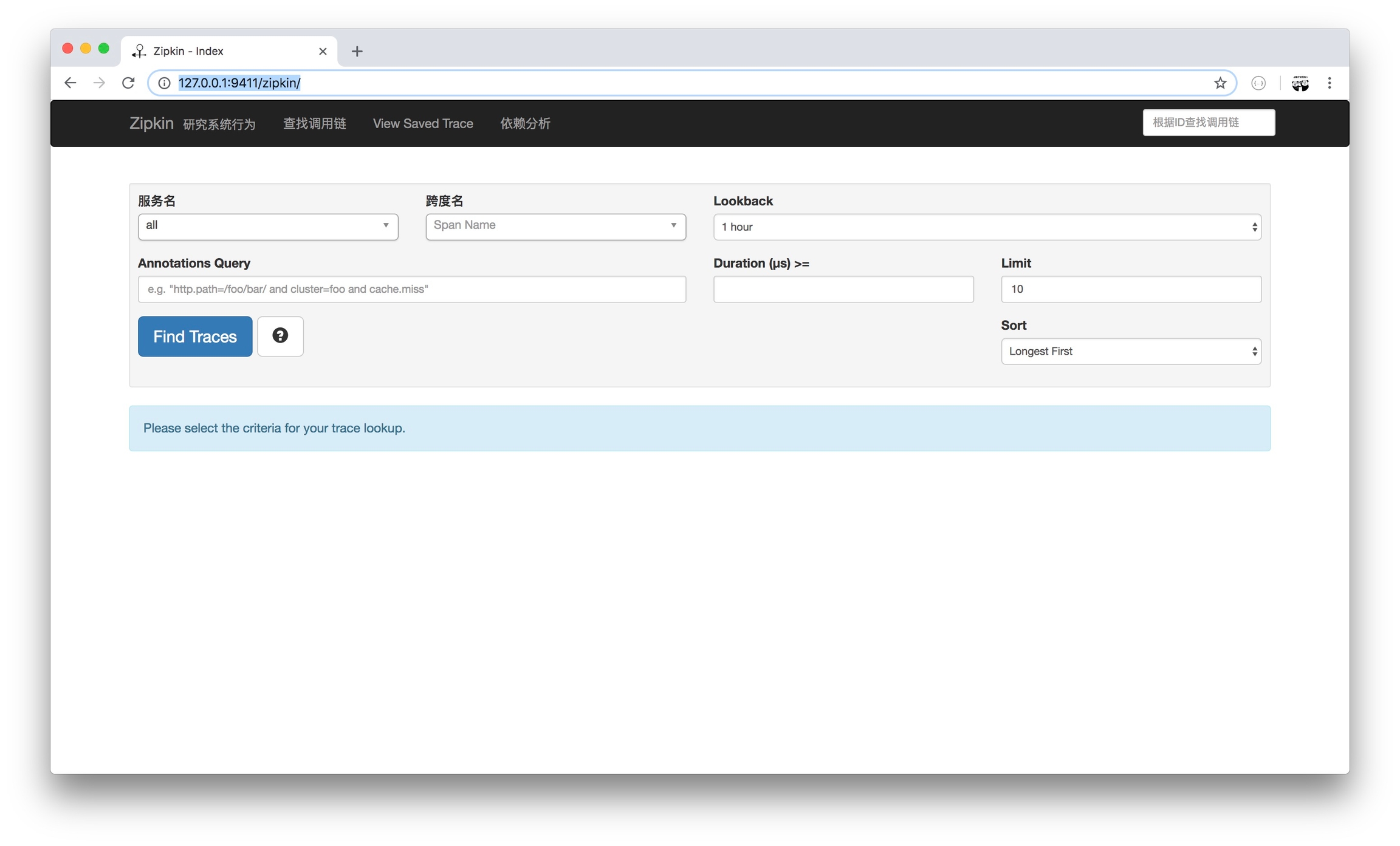 访问 http://127.0.0.1:9411/zipkin/ 检查 Zipkin 是否运行正常