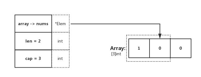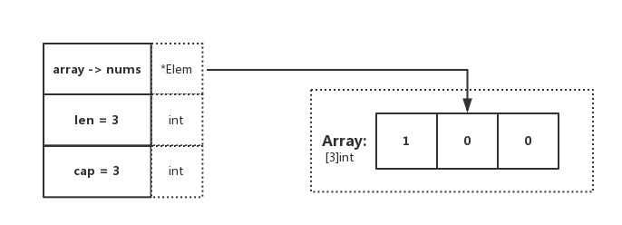 在代码中,可观察到 dnums := nums[:],这段代码确定了 Slice 的 Pointer 指向数组,且 len 和 cap 都为数组的基础属性。与图示表达一致