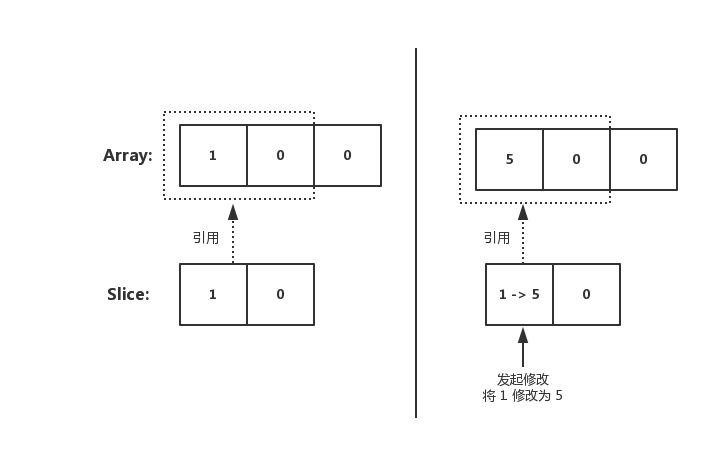 在未扩容前,Slice array 指向所引用的 Array。因此在 Slice 上的变更。会直接修改到原始 Array 上(两者所引用的是同一个)
